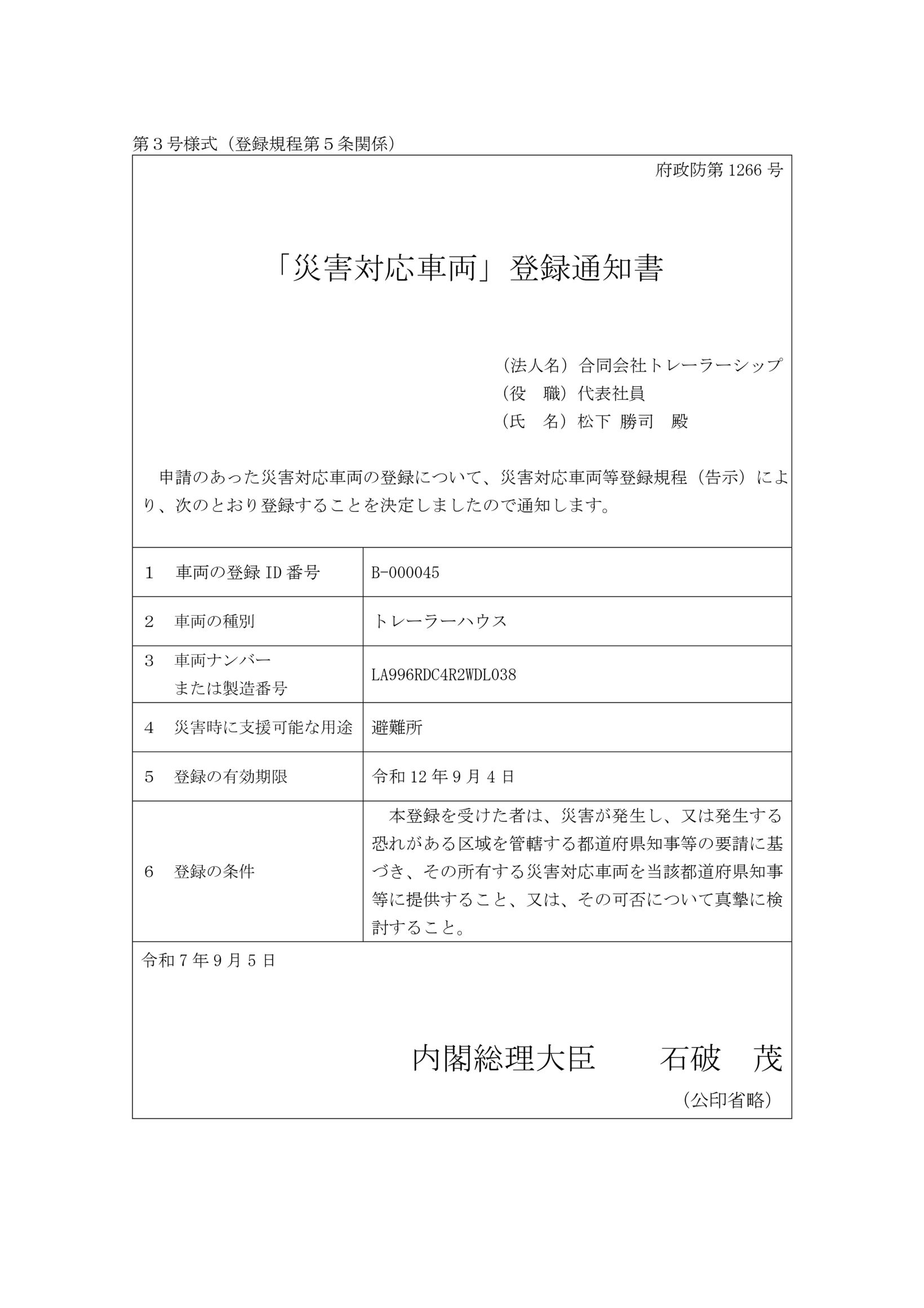 このたびTARAILER SHIPのトレーラーハウスが「災害対応車両」として登録されました。